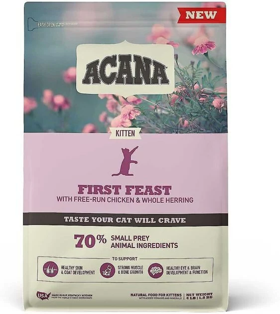 - The ACANA First Feast recipe is made in the USA with small-prey ingredients and liver for a purr-worthy taste.