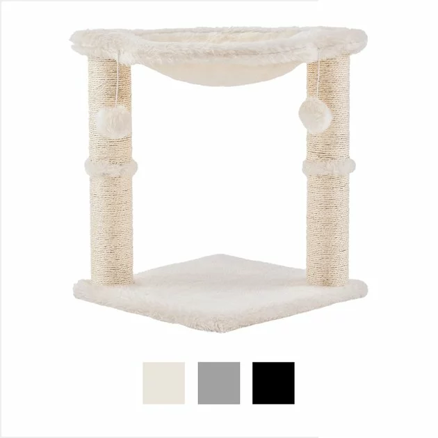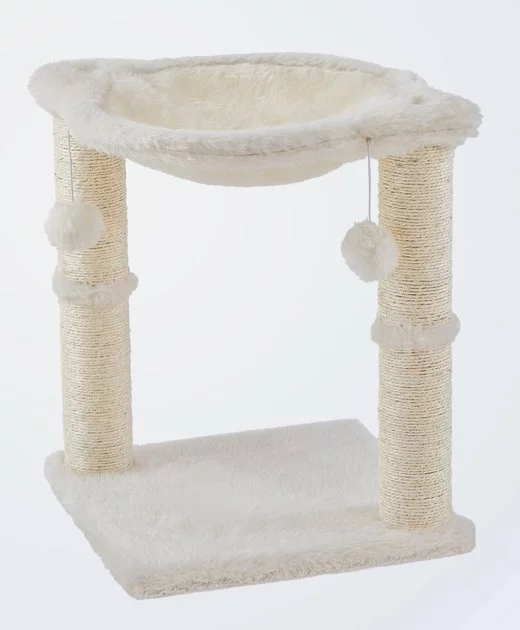 If you want to give your kitty a spot of his own, but don’t have room for a colossal cat tree, then the Frisco 20-Inch Cat Tree is the ideal solution. It’s just big enough for your cat, and compact enough to fit in any room or out-of-the-way corner. This stylish cat tree has a sleeping hammock on top where your kitty can curl up and snooze the day away. Plus, it gives him a spot to watch over his sprawling indoor kingdom. The nap area and the base are covered in a thick plush material that’s cozy and soft to the touch. Two pillars wrapped in natural sisal rope give your cat an appropriate place to stretch and scratch. And the dangling pom-pom toys are sure to appeal to your feline’s mouse-hunting instincts when it’s time to play. With a neutral ivory color, it fits right in with your home décor. This fashionable cat tree is recommended for kittens and small cats to enjoy.