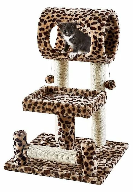 This all-in-one cat tree is recommended for kittens and small cats to enjoy. With the animal print Frisco 28-Inch Cat Tree, your kitty can answer the call of the wild—even when she’s indoors. This cat tree has everything your cat needs to play, hunt, jump and sleep in one compact tree that she can claim as her own. It comes with two vertical posts that are covered in natural sisal rope—perfect for sinking her claws into. There’s also a horizontal post that spins around as your kitty scratches the sisal covering. These special scratching areas help satisfy her natural urge to scratch instead of using your furniture. When it’s time to “hunt,” your frisky kitty can jump onto the middle perch and bat around the fuzzy hanging pom-poms. After playtime, your cat can crawl inside the tube-shaped hideout at the top of her tree for a long nap. The widened, oval opening lets her easily climb through from the middle perch to this cozy, private sleeping spot. The base and perches are covered in a soft material with a fun animal print pattern.