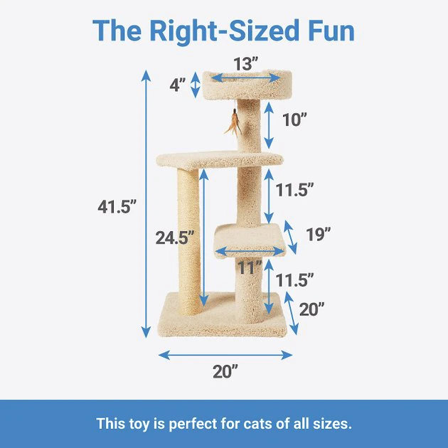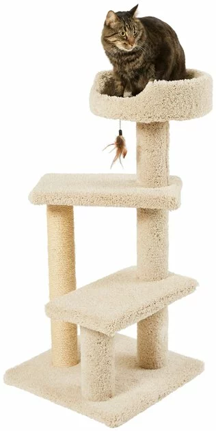 Three levels of cat tree for three times the feline fun and relaxation. This three-story cat tree includes one tall, round perch and two mid-level platforms to give your cat loads of spots to hang out and relax. It’s got a sturdy wooden frame, and it’s wrapped all over in household carpet your cat will love to snuggle up on. Plus, it has a sisal-wrapped post to entice your cat to really scratch away, helping protect your furniture, carpet and drapes from kitty claw destruction.