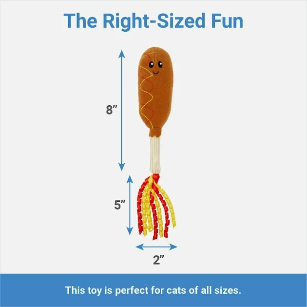 Take your kitty out to the ball game with this baseball corndog cat toy. Your baseball-loving feline loves a good corndog, but especially when it’s stuffed with catnip and soft plush material to cuddle, kick and paw at. Plus, it has fun ketchup and mustard curly strings so your kitty can practice their batting skills. Batter up for playtime!