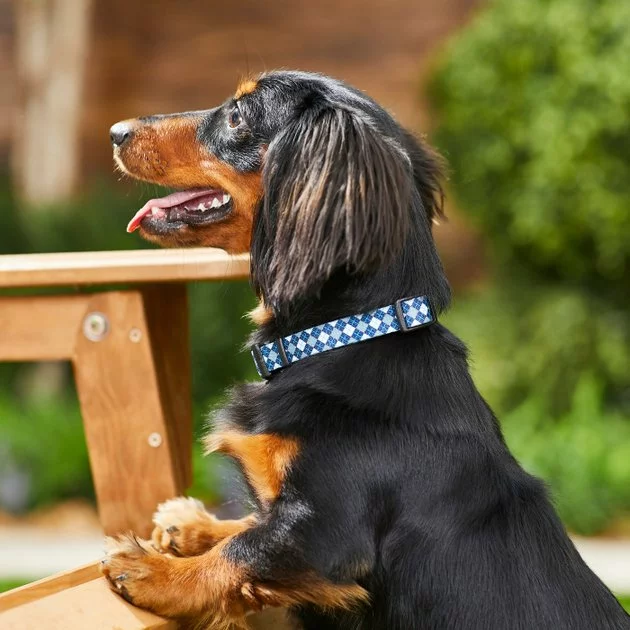 - Fun, argyle pattern with monochrome blues adds a bit of style to your pup’s collar, with various sizes available and adjustable slides to ensure a comfy fit.
