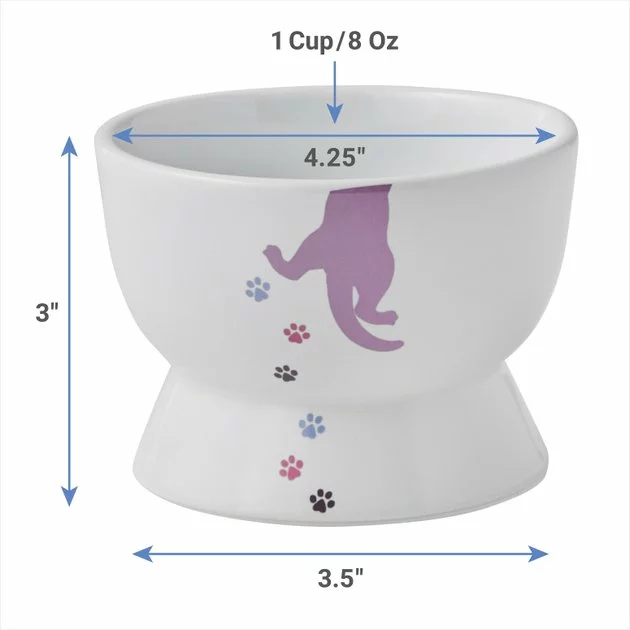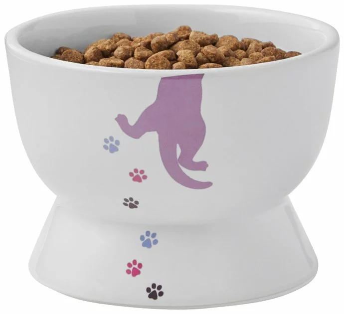 - Elevated, ceramic cat bowl featuring colorful cat and paw prints on the outside.