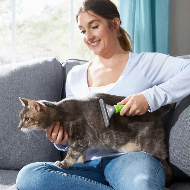The Frisco Deshedding Pet Brush blasts away those furry tumbleweeds around the house! With a 4.5” stainless steel blade built for durability, angled tooth design and ergonomic handle, this deshedding tool is great for tackling tough tangles and knots in your short to medium-haired pet’s coat while helping to reduce overall shedding of dead, loose hair. Plus, it has a lightweight, ergonomic handle with a soft, non-slip grip to help you stay comfortable and in control during grooming.
