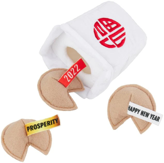 - Traditional Chinese New Year toy set includes plush takeout box with three fortune cookie toys.