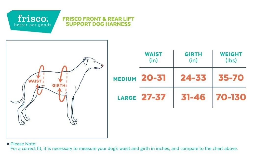The lifting harness is recommended for medium and large breeds ranging between 35-130 pounds. Using a cloth measuring tape or printable measurement tape, measure the dog’s girth and waist and compare to size chart located on the ‘Size’ tab. The weight measurement can be used as a guide to determine best sizing. This harness is fully adjustable.