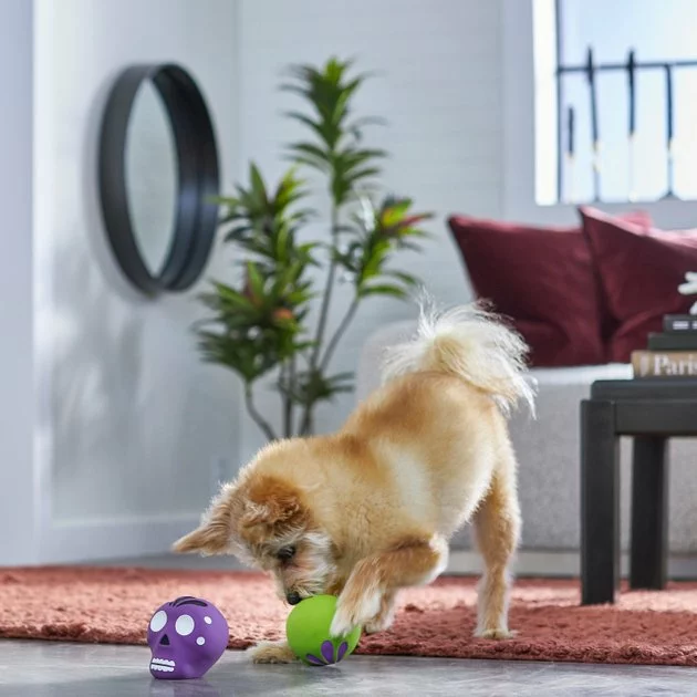 This two-pack of latex toys means double the squeaky, squishy fun for your pup’s Day of the Dead celebrations! It includes a set of brightly colored sugar skulls, both made of squishy latex that pups love to grab onto, catch and carry. Plus, they’ve got built-in squeakers. All your dog has to do is smush them a little bit to hear the symphony of squeaks inside! Whether your pup likes a game of catch or fetch, or some solo playtime, this two-pack is up for it this Halloween.