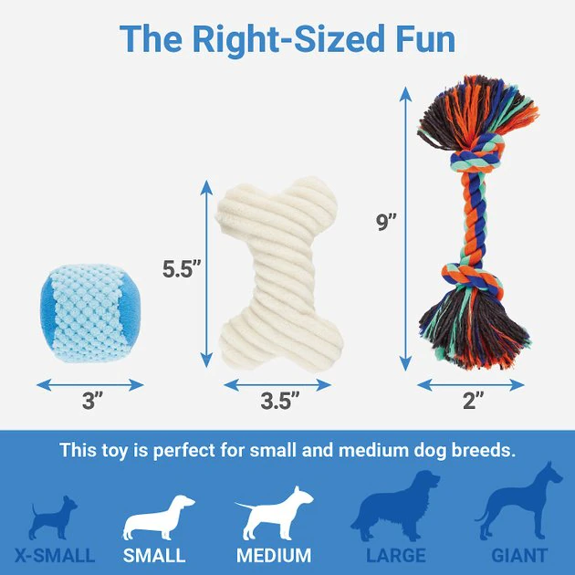 - Comes with plush squeaky ball, plush squeaky bone and rope toy.