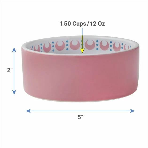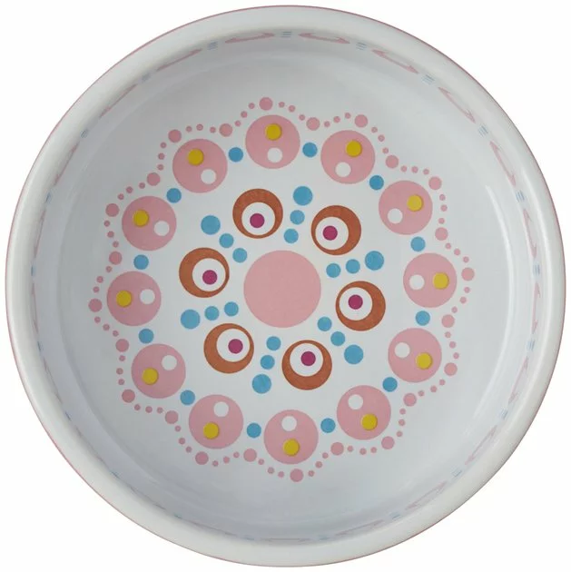 - Bright, poppy ceramic cat dish with solid pink around the outside.