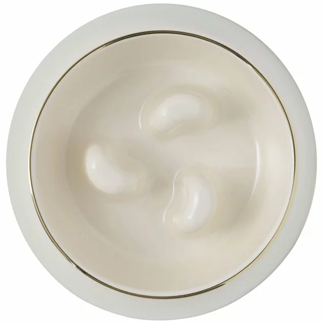 - Cream-colored melamine slow feeder with a tasteful gold trim accent.
