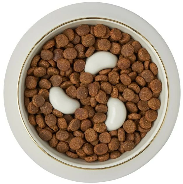 For fast eaters and fashionable pet parents, the Frisco Melamine Slow Feed Dog & Cat Bowl with Gold Trim is sure to be a hit. With its soft, cream color and elegant gold trim around the top, this bowl adds a bit of clean, stylish design to your dog and cat dinnerware and fits in great with your home décor. The slow-feed design with raised columns inside prevents gulping and helps slow your dog and cat down when it’s mealtime to help promote proper digestion and help cut down on bloating too.