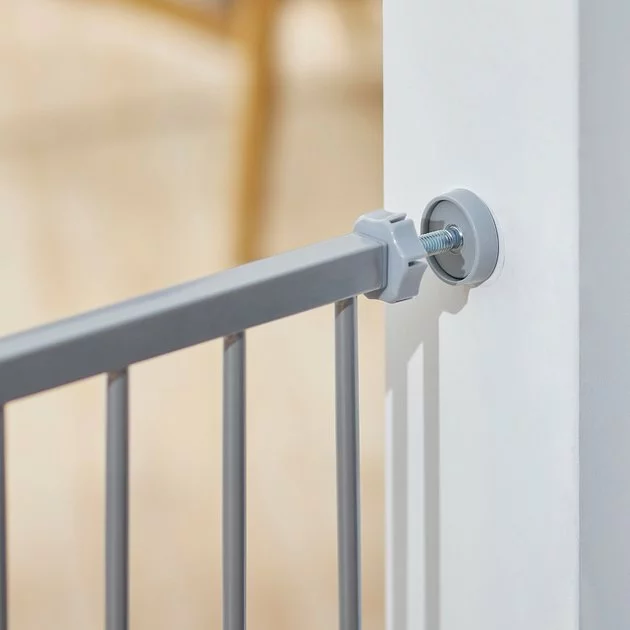 Check out the Size tab to be sure this gate fits your doorway. Turn any room in your home into a pet-safe zone with the Frisco Metal Pattern Extra Wide Auto-Close Pet Gate. With its durable, metal construction, this gate is designed to keep your pet safely contained; and with its cool, geometric pattern, it’s sure to make a stylish addition to your home. Simply install it in a door frame or hallway to provide your pet with a place all their own. The pressure mount system makes setting it up and taking it down easy, so you can move it to different areas of the house as needed. The gate door works double duty by staying open when you need it to—just open it past 90 degrees to lock it open—or otherwise closing on its own. You can also set up the door to open on either side. The dual-lock safety release means your pal can’t get crafty and open the door, adding a layer of security. Plus, this gate is lightweight so you can transport it and store it easily.