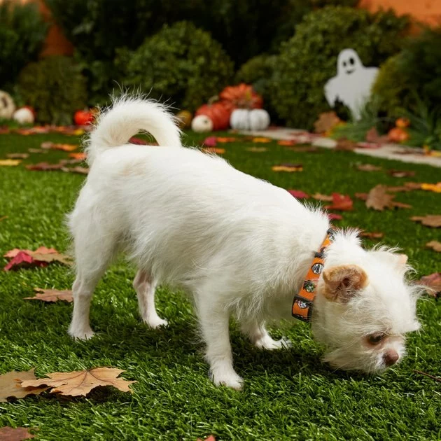 Your pup can paw-ty under a full moon in style with the Frisco Monster Bash Dog Collar. Designed for everyday wear, these collars combine comfort, security and fashion. These collars are made with durable, high-quality polyester that has an Ultra-Weldâ„¢ seal, strength-tested to withstand up to seven times the maximum recommended weight for each size. Easy to put on, it has a plastic buckle with rounded edges for comfort and a nickel-coated D-ring. They come in different sizes with adjustable slides for a custom fit, even for growing puppies. Plus, all sizes come with a separate ring to attach an ID tag.