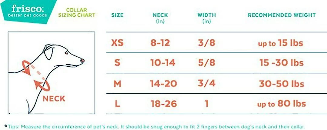 Remember to measure your pet for the paw-fect fit. The Frisco Patterned Dog Collar is a retro-inspired, elegant collar that is sure to make your pup the most stylish canine on the block. Designed for everyday wear, this collar prepares your four-legged friend for adventures outdoors and provides comfort and security during your daily walks. It comes in multiple sizes with adjustable slides so you can make sure your pup has the perfect fit. This is also a great feature for puppies that may still be growing. When your pup is waiting at the front door, hinting for a walk outside, this collar goes on with little effort so you won’t spend tons of time getting ready. To easily and securely attach your pup’s leash, simply clip it onto the D-ring, and you’re all set. Most sizes also feature an ID ring for attaching ID tags without cluttering the leash ring. It’s made for durability with high-quality, polyester webbing that’s been lab tested to withstand up to seven times the maximum recommended weight for each size. For a clean, polished look, this collar is made with sleek, nickel-coated hardware, and the plastic buckle is curved for your dog’s comfort. The Frisco Patterned Dog Collar also has a matching Frisco Patterned Leash option so that you and your beloved fur friend can really strut in style.