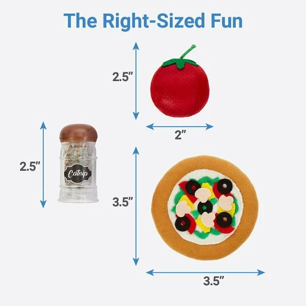 - Adorable pizza party design comes in a three pack—includes a pizza toy, catnip shaker and tomato.