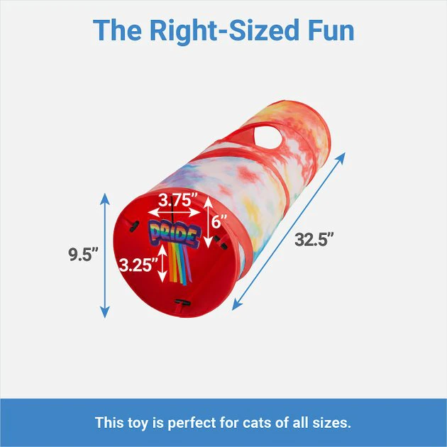 - Pride tie-dye foldable tunnel cat toy is perfect for getting your feline friend movin’ around while keeping boredom away.