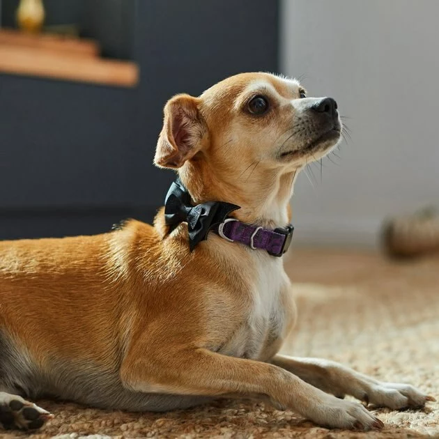 - Dress up your dog’s Halloween look with a purple bat-patterned collar and removable bat wings accessory.