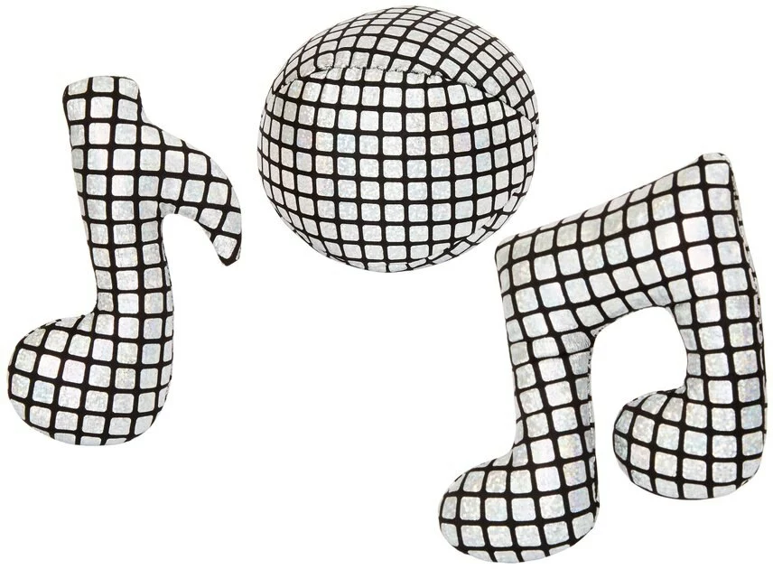 - Comes in a three-pack with a disco ball and two musical notes for your dog to groove to.