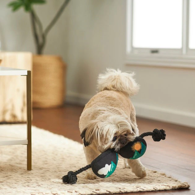 Your pup won’t want to hit the road without their favorite sunnies! The Frisco Road Trip Aviator Sunglasses Plush is a pup-approved toy your dog will want to pack on your next playtime adventure. The soft, fabric plush is easy on your dog’s mouth and the ropes on both ends make this toy great for chewing and fetching. Plus, it features two squeakers to amp up playtime excitement.