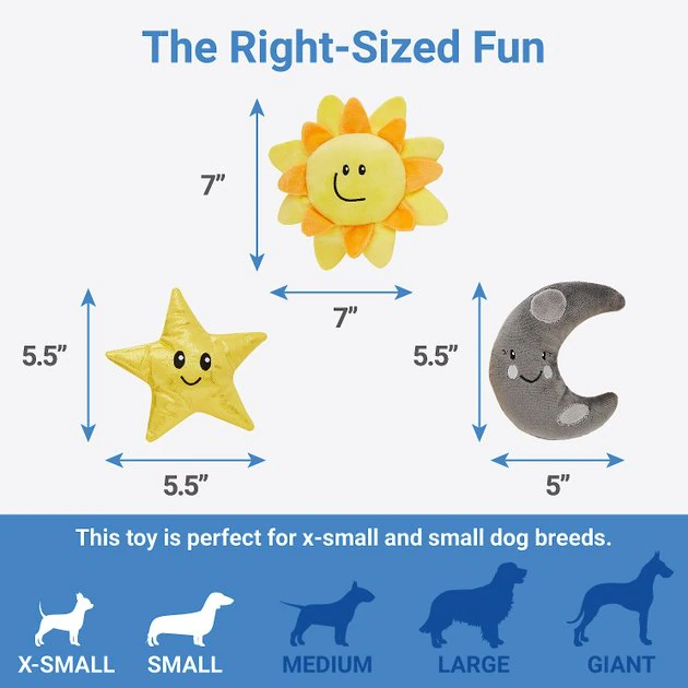 Your pup would play all day and all night if they could! This three-count Frisco Road Trip Sun, Moon, and Star Plush Squeaky Dog Toy will make playtime extra fun, no matter what time of day it is. It features a smiling sun, moon and star that your pup will love to toss and fetch. Each plush toy has a built-in squeaker so your pup can make their own squeaky road trip playlist. With these cute squeaky plushies, your dog will want to play till the stars come out!