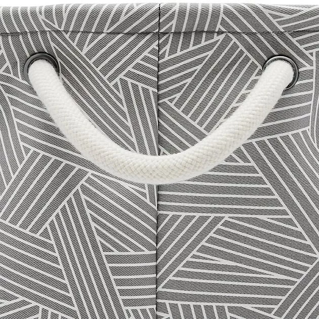 - Round, collapsible bin covered with neutral gray basket weave polyester fabric.