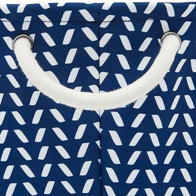 - Round, collapsible bin covered with stylish navy herringbone polyester fabric.