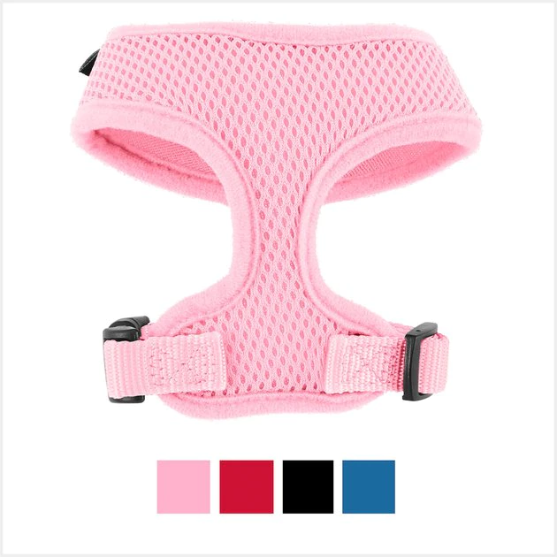 - Small and medium breed soft mesh harness has an over-the-head design. To ensure best fit, use the sliders to tighten.