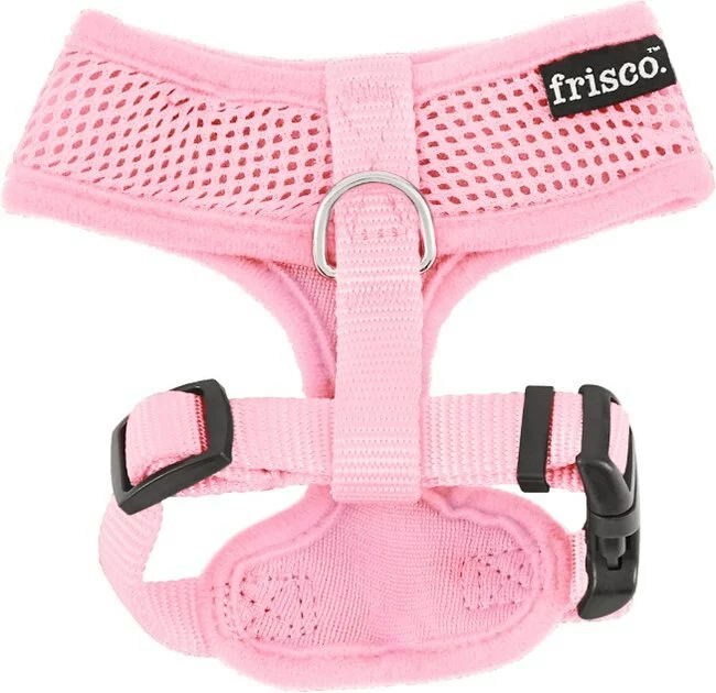 Remember to measure your pet for the paw-fect fit. The Frisco Soft Mesh Dog Harness provides pet parents with a soft, easy-to-use harness. Made with breathable mesh material, this harness will help your pet stay comfy and cool while out on their everyday walks. The over-the-head design and fast-release buckle make it easy to get on and off, while the adjustable slide on the belly strap ensures that you get the perfect fit to keep your pup secure. The D-ring at the back of the harness is secured using durable nylon fabric for you to attach your leash to, so you will always feel in control. This soft mesh dog harness comes in sizes from small to extra-large, and in four different colors—pink, red, blue and black—so you can choose the one that best suits your pup and their style.
