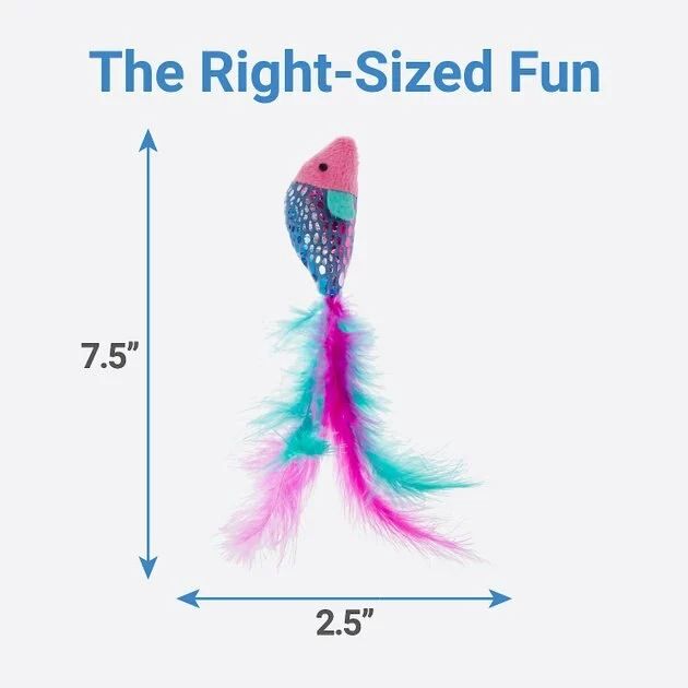 - The enticing feathers and shiny “scales” activate your cat’s natural instinct to play.