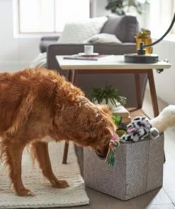 Post-playtime messiness? Pick up a Frisco collapsible storage bin and say goodbye to the days of pet toy piles and stepping on random squeakers! This square toy bin keeps all their toys in one place so you’ll always know where their cuddly plushies, favorite ball or squeaky toys are (when they aren’t carrying them all around the house, of course), and you’ll always have a convenient spot to start those long, fun play sessions, whether your pet barks or purrs. Plus, it’s covered in neutral gray basket weave polyester fabric to compliment any home décor, and it features an easy-access front cutout so your pet can reach their toys whenever playtime inspiration strikes!