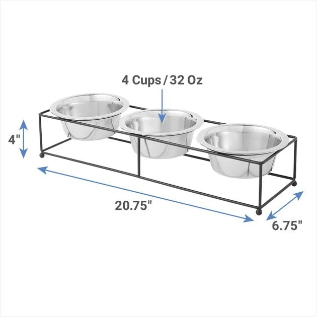 elevates dinnertime for your dog or kitty and gives you three feeding options in one. The durable iron stand keeps bowls where pets want them, and the straight design makes it ideal for any room of the house. Hand wash the removable stainless-steel bowls or throw them in the dishwasher for easy cleaning.