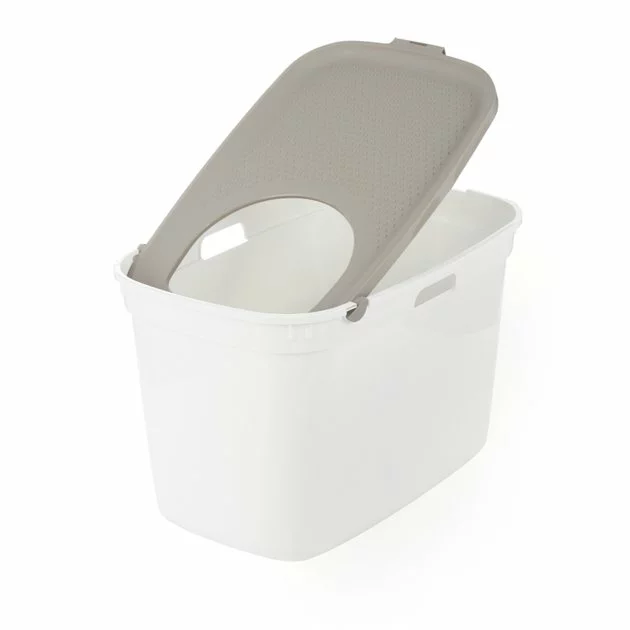 - Top-entry cat litter box features wide opening at top for cats to enter, while helping to keep dogs out.