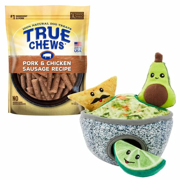 - Comes with the Frisco Hide and Seek Plush Guacamole Dog Toy and a 14-ounce bag of True Chews Pork & Chicken Sausage Recipe Dog Treats.
