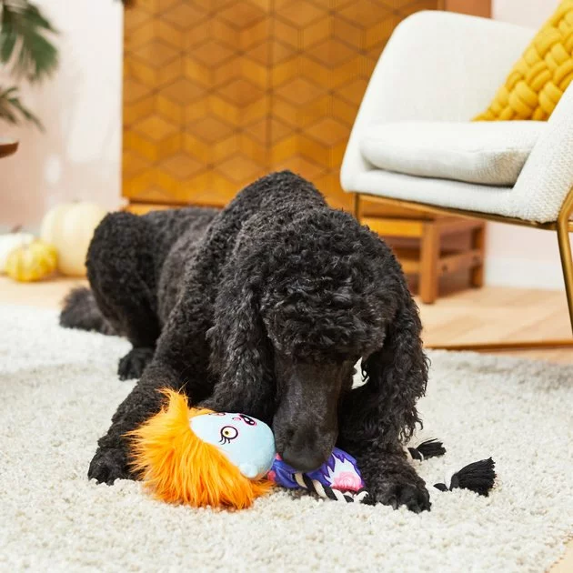 They’re alive! This super cute zombie toy is always ready for playtime. With a soft, plush body, your pup will love giving it a really good squish. The knotted rope in the arms and legs makes for a ghoulishly good time and interactive fun with you. Toss it, wiggle it, play fetch, too! This zombie cutie goes squeak in the night with two internal squeakers so you can turn up the spooky fun for all their Halloween games.