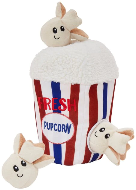 It’s not a night at the movies without a trip to the concessions stand! This puzzling plush hide-and-seek popcorn toy comes with a big bucket of popcorn and individual squeaky popcorn kernels your pup can burrow for. Movie previews just got a lot more playful!
