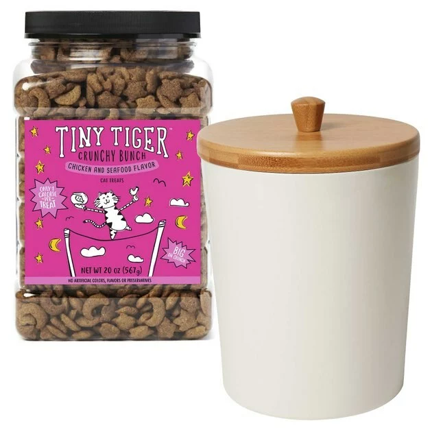 - Each purchase comes with Tiny Tiger Crunchy Bunch, Fearless Feathers and Gracious Gills, Chicken & Seafood Flavor Cat Treat, 20-oz Jar & The Frisco Melamine Dog & Cat Treat Jar with Bamboo Lid, 8 cups.